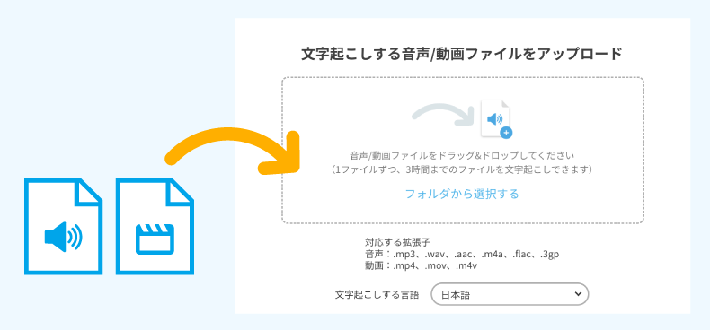 お持ちのボイスレコーダーやビデオカメラ、アプリなどで録音/録画したデータをブラウザからアップロードして文字起こしできます。