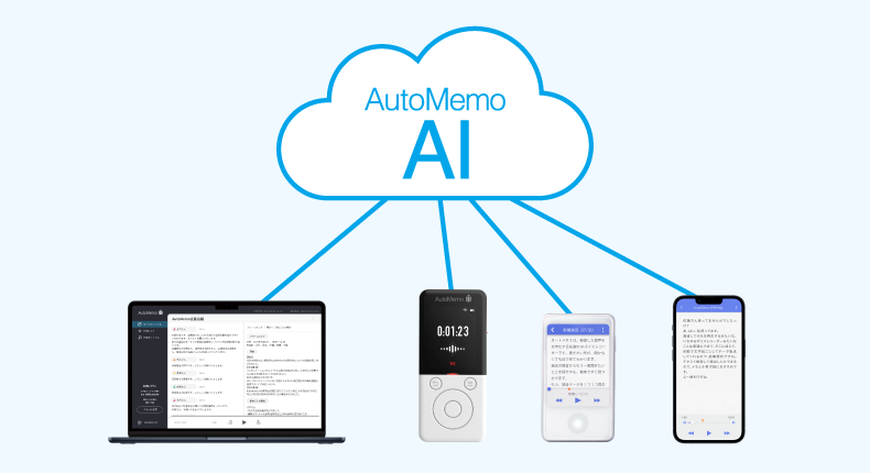 どの方法で音声を録音/アップロードしても、データはオートメモ・クラウド上に保存され、同じアカウントでログインすれば、同じデータにアクセスでき、必要な人と共有できます。