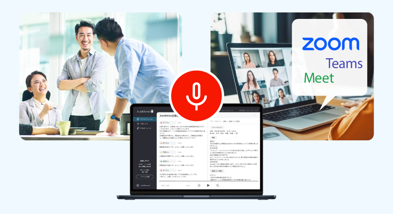 対面でもリモートでも、少人数のミーティングでも大規模な会議でも、直接録音でも録音済データでも。